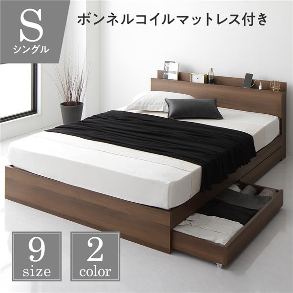 【売れてます】ベッド 収納付き シングル ブラウン ベッドフレーム ボンネルコイルマットレス付き ハイクオリティモダン 木製ベッド 引き出し付き 宮付き コンセント付き残りわずか