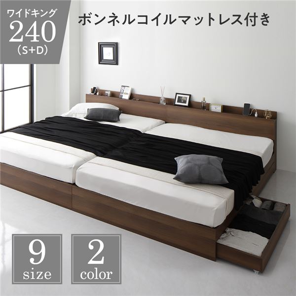 収納付き ベッド ワイドキング240(S+D) 引き出し付き キャスター付き 棚付き コンセント付き ブラウン ボンネルコイルマットレス付き